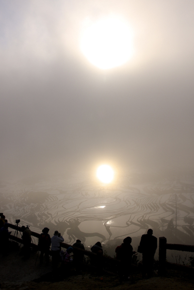 | 얼마 전 일반인들에게는 생소한 나평과 홍하여행 출장을 다녀왔다. 그곳은 그야말로 1000년이 넘는 세월동안 인간의 손으로 이룩해온, 신비롭고 아름다운 예술의 땅이었다. 나평과 홍하여행의 하이라이트는 나평의 유채꽃밭, 홍하의 다락논이다. 하지만 50년 만에 찾아온 이상기온으로 인해 나평의 유채꽃밭은 사진으로만 보아오던 샛노란 유채꽃밭이 아니었다. 때아닌 폭설과 영하의 기온이 유채꽃을 얼려 일찍 지고만 것이다. 황금빛 유채꽃 물결을 기대했던 분들은 조금 실망을 했겠지만 그래도 수평선 너머로 끝없이 펼쳐지는, 사방을 둘러보아도 온통 유채꽃 천지인 그곳은 경이로움 그 자체였다. 나평 유채밭에서의 아쉬움은 홍하 원양의 계단식 논의 일출에서 말끔히 사라졌다. 말로 표현할 수 없는 멋진 일출을 목격한 것이다. 어둠이 깔린 이른 새벽, 일출을 감상하기 위해 도이수 풍경구로 출발할 무렵 산등성이를 안개가 휘감아 돌기 시작하더니 어느덧 안개가 산 전체를 뿌옇게 가려버렸고 일출을 못 보는 게 아닌가하는 걱정이 들기 시작했다. 하지만 걱정도 잠깐, 해가 솟아오르기 시작하자 안개가 조금 걷히는가 싶더니 오히려 더 멋진 장관을 연출했다. 산을 타고 넘어오는 안개는 초를 다투며 빠르게 이동했고, 마치 장시간에 걸쳐 녹화한 비디오테이프를 몇 배 속도로 보는 듯한 착각이 들 정도로 시시각각 다른 풍경을 연출했다. 그렇게 안개와 함께 산 능선위로 붉은 태양이 떠오르기 시작했다. 그러다가 일순간 안개에 가려 잠시 태양이 안 보이더니, 이번에는 계단식 논바닥에서 또 하나의 태양이 떠올랐다. 모든 사람들은 일제히 탄성을 지르는가 싶더니 한 동안 숙연해졌다. 안개 이동하는 모습에 따라 카메라 셔터소리만이 고요한 적막을 깨울 뿐 모두들 저마다 사진기에, 가슴속에 그 광경을 담아내느라 정신이 없었다. 일출을 감상하고 따뜻한 커피로 몸을 데운 후 버스에 올라타자 모두의 얼굴에는 흐뭇한 미소가 감돌았고 "오길 정말 잘했어."라는 말이 여기저기서 터져 나왔다. 현지 가이드도 이렇게 멋진 일출은 처음 본다는 말에 기쁨은 두 배가되었다. 돌아오는 버스 안에서 오늘 이 순간의 감동에 대하여 서로 말을 아끼기로 했다. 그 누가 물어보아도 이 느낌에 대하여 침묵하기로… 아름답다 못해 경이롭기까지 했던 오늘의 감동적인 장면은 직접 보지 않은 사람에겐 어떤 말로도 표현할 수 없기 때문이라고 했다. |