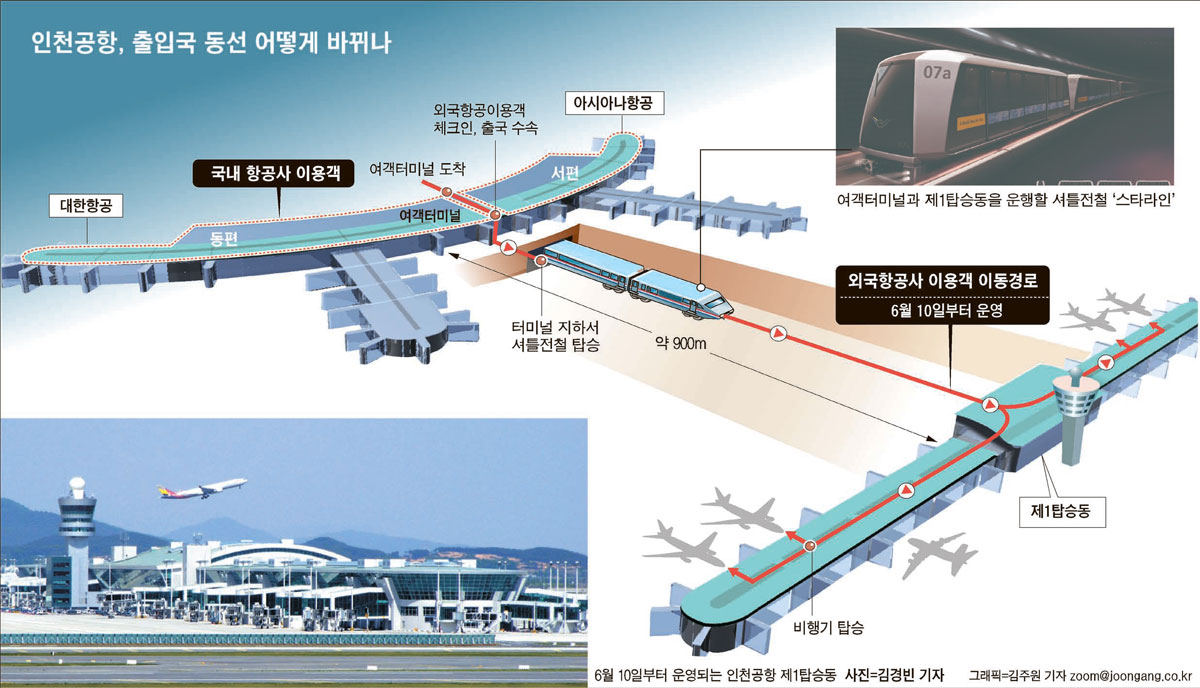 | 지난 5월 27일부터 인천 국제공항이 새롭게 바뀌었다. 기존의 터미널에 새로운 탑승구가 완공되어 재개장한 것이다. 이번에 새롭게 개장한 탑승동은 외국항공사에 배정되었기 때문에 국적기(대한항공, 아시아나 항공)를 이용하는 승객은 아무런 변동 없이 기존과 같이 공항을 이용하면 된다. 외국항공사를 이용하는 경우에는 기존의 여객터미널에서 약 900m 정도 떨어진 새로운 탑승동을 이용해야 한다. 하지만 입출국 수속과 수화물 처리는 기존의 여객 터미널에서 이루어진다. 새 탑승동은 기존 여객터미널의 1/3 크기로 30개의 탑승구를 갖추고 있으며, 면세점과 어린이놀이터 등 별도의 편의시설이 운영된다. 외국항공사 이용고객은 기존의 여객터미널에서 체크인과 출국수속을 마치고 면세구역에 들어간 후 지하 2층으로 내려가야 한다. 지하 2층에서는 기존의 터미널과 새로운 탑승동을 연결하는 '스타라인'을 타고 이동한다. '스타라인'은 싱가포르 창이 공항의 경전철과 같은 모델로 24시간 무인 운행한다. 시속 50㎞속도로 3분에서 5분 간격으로 운행되며 이동시간은 1분 정도이다. 한번에 최대 261명의 승객이 이용 가능하다. 여객터미널의 탑승구를 이용하는 국적기 탑승 객은 원래대로 1번∼50번을 이용하며, 새 탑승동의 탑승구는 101번∼132번이다. 6월 10일부터는 여객터미널의 항공사 카운터 위치도 새로 배치되었다. 3층 여객터미널로 들어가서 우측은 대한항공, 좌측은 아시아나 항공, 가운데에는 외국 항공사가 자리 잡았다. 인천 국제공항을 이용해 출국시 혼돈이 생기지 않기를 바란다.