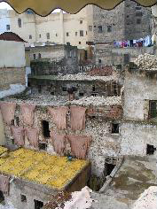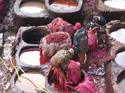 도저히 인간이 견딜 수 없는 환경 속에서 감정 없는 연장 같은 동작으로 가죽과 함께 뒹굴고 있다. 사지가 잘린 가축의 일부를 밟고 뒤집고 치대고.... 반복적으로..... 그렇게 염색된 가죽들은 주변 건물의 벽이나 옥상에서 말려지고 있다.