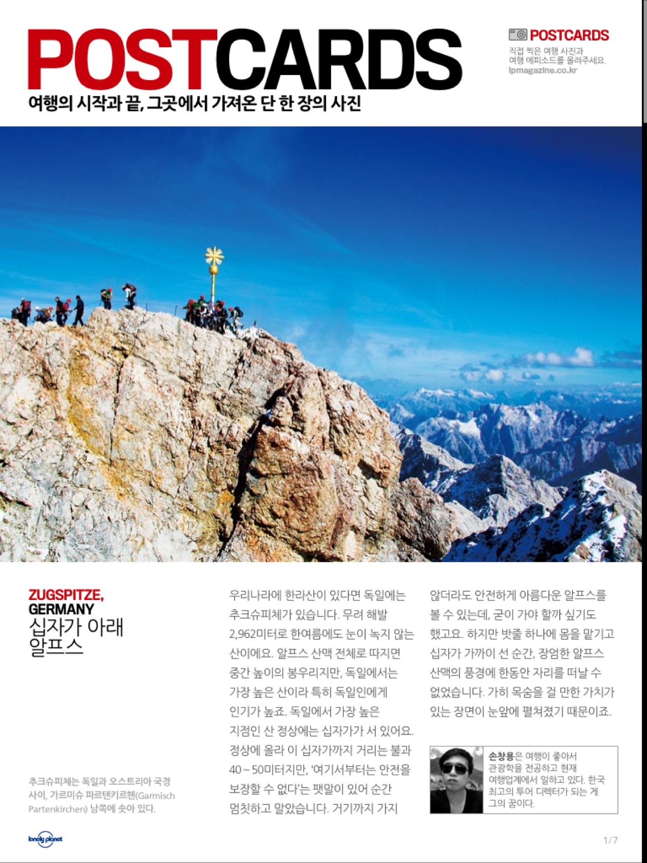 작년 가을, 독일 여행 때 찍은 추크슈피체 사진이 여행을 좋아하는 사람이라면 한 번쯤 들어 봤을 한국판 론리플래닛 10월호에 위의 글과 함께 실렸다. 9월호에 아름다운 독일 사진 이벤트가 있어 큰 기대는 하지 않고 응모하였는데, 최우수 사진에 선정된 것이다. 당시 워낙 날씨도 좋았고, 어디라 할 것 없이 카메라만 들이대면 그림 옆서 같은 풍경이라 이런 사진이 찍혔던 듯싶다.