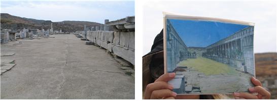아고라의 왼편, 신전과 아폴론 거상이 있었던 지역으로 갔다. 아고라에서 신성지역으로 들어가는 대로는 지금도 옛 영화를 느낄 정도로 넓고 뒹굴고 있는 돌들도 범상치 않다. 김경자씨가 훼손되기 전의 상상도를 보여주는데 어제 본 학술원보다 멋있는 신전들이 줄지어 서 있다.