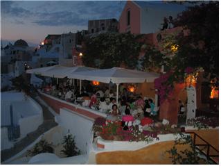 저녁 식사는 이 섬 끝, 이아에 예약이 되어 있었다. 그곳의 일몰 감상을 염두에 두고 예약을 했을텐데 배의 연착으로 이미 날은 어두워진 상황이다. 그래도 예약이 되어 있으니 이아까지 가기로 했다. 산토리니의 중심 마을 피라에서 이아로 가는 길은 생각보다 멀었다. 바다에 가까운 옛길로 가는데 바람이 미친 듯이 불어댄다. 어둠에 잠긴 산토리니는 7~8월 태양에 모든 것이 말라버린 듯하며 하얀 집들만 어둠 속에서 푸른 보랏빛으로 부각되어 보인다. 나무들은 바람에 넋을 놓고 흔들리고 검은 바다는 기괴한 울음소리를 내고 있다. 카 오디오에서는 이런 상황과 관계없이 지극히 감미로운 음악이 흘러나왔는데 그 조합이 절묘하게 감성을 자극한다. 멀미에 지친 일행들도 너무 조용하다. 이 상태로 영원히 달렸으면 좋겠다.