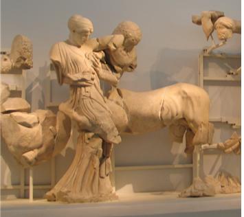 여행을 하기 전, 이 책 저 책을 뒤지다보면 너무 많은 것을 숙지하게 되어 정작 여행지에서는 신선한 감흥도 잃고 익숙한 것으로 착각해 맥 빠질 때도 있다. 하지만 모르면 그냥 스쳐지나갈 수 있는 것을 놓치지 않고 볼 수도 있다. 지금과 같은 경우가 그렇다. <모레아 기행>을 읽지 않았다면 이 방의 감동을 절대 느낄 수 없다. 문제는 카잔차키스의 감동과 나의 감동이 일치하게 되면 오롯이 내 것이 아니라는 불쾌감이다. 나도 켄타우로스가 라피타이족 여인을 쫒아가 유방을 움켜지고 있는 모습을 보면서 동물적 본능으로 이글거리는 야만적인 육체의 힘을 온 몸으로 느꼈다.