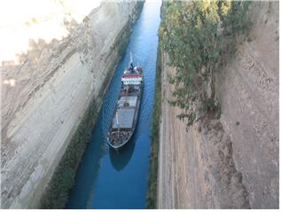 4년 전 이곳에 도착했을 때는 땅거미가 내려앉을 시간이었다. 깊은 단애(斷崖)속에서 푸른빛을 반사하고 있는 검은 바다는 아주 인상적이었다. 인간의 힘으로 지구의 모양을 바꾼 미욱한 위대함이 진한 감동으로 몰려왔었다. 특히 같이 온 일행들의 환호성을 잊을 수가 없다. 터키를 거쳐 그리스로 넘어온 우리는 여행의 마지막을 즐기고 있었다. 그때까지의 여행이 대부분 폐허의 장소에 누워 있는 돌기둥만 보면서 과거의 시간 속을 떠돌다가 밝은 조명의 화물선이 콘테이너를 가득 싣고 보무도 당당하게 운하로 진입하는 모습에 모두 박수를 치며 즐거워했었다. 여행에 지쳐있던 사람들이 현재 진행형의 역사 현장을 보면서 갑자기 생동감을 느낀 것이었다. 자신들 모두가 건강하게 살아있다는 것을 확인받은 것처럼... 그런데 지금은 나부터 신선한 충격도, 감동도 없는 그저 운하일 뿐이다.