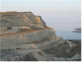 | 오늘도 날씨가 너무 좋다. 아침 식사 전 호텔 주변을 산책하다가 공사를 하느라 땅을 다 파놓은 곳을 지나게 되었다. 그곳은 산토리니의 지층이 선명하게 다 들어나 있었는데, 화산재가 오랜 시간의 압력으로 응회암으로 변해 여러 겹으로 쌓여 있다. 이렇게 약한 지반 위에 세워진 예쁜 집들이 새삼 걱정스러워진다. 종국에는 터키의 카파도피아와 같은 지형으로 변할 운명의 땅이다. 그래도 인간은 또 어떻게 해서든지 살아남을 것이다.