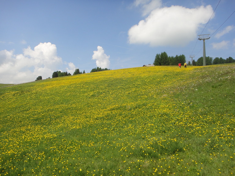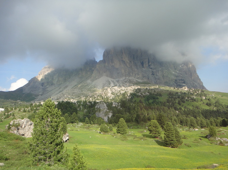 봉이 엄청난 눈을 이고 병풍처럼 막아 선다. “Capanna Passo” 3152m 아래 계곡 Piz Boe에서 올라오는 구불거리는 산악 도로에는 오트바이를 탄 젊은이들이 올라온다. 좌우 정상에서 30여분간 주변을 감상하고 사진에 담은 후 내려오니 노란 야생화가 융단처럼 깔리었고, 산록에는 집이 한, 두 채 씩 드문드문 자리잡은 곳으로는 좁은 길이 나있고, 주민들이 거주하니 도로, 수도, 전기 등이 다 설치되어 있다. 이런 산간에도 주민의 살 권리를 존중하여 정부에서 시설을 뒷받침하여 준다 하니? 또 한 경이로운 것은 이런 산간 비탈에 조그마한 마을에도 교회가 서있고 종탑이 고스란히 남아있다.