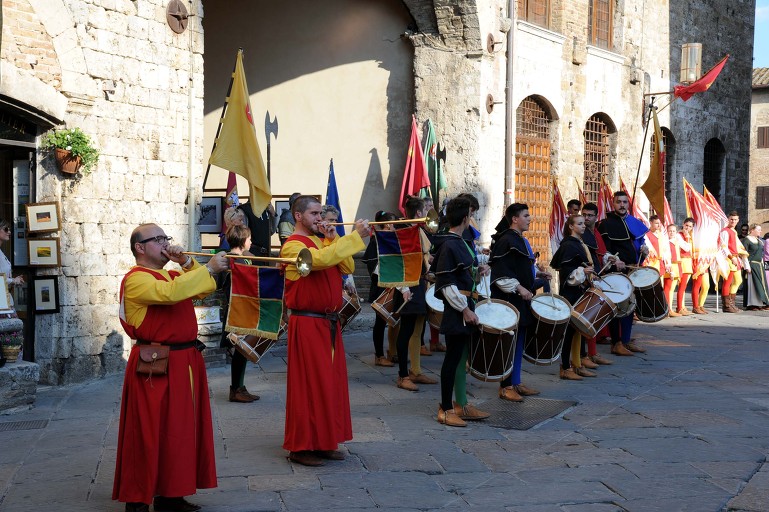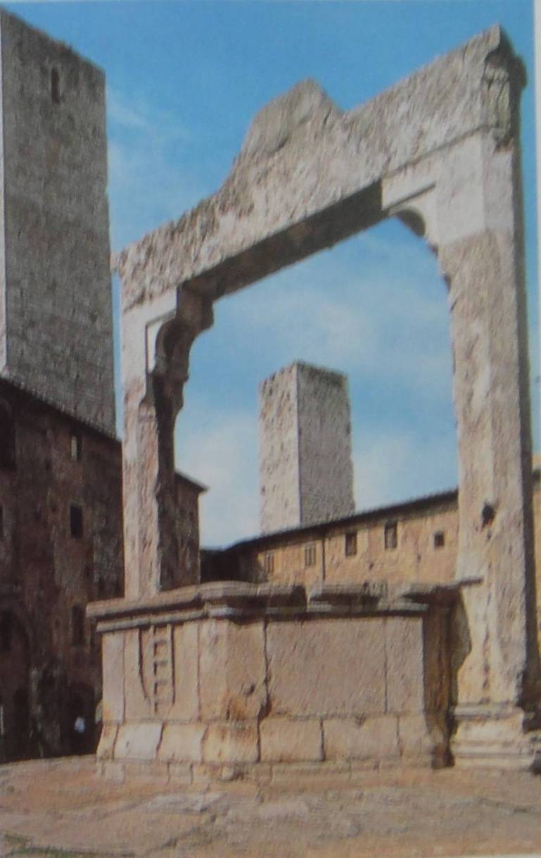 도시를 남북으로 갈라서 올라가 내려가는 언덕을 중심으로 모든 탑들이 솟아있어 장관을 이루고 있다. 이 소도시는 순례자들이 찾아 들어 성지가 되면서 발전하였으나 1348년 흑사병의 창궐로 쇠퇴하게 되어 1353년에 피렌체에 합병되었으며 그 후 잊어진 도시가 되었다. 그 후 이곳이 영국의 캔터베리 대주교가 990년, 994년 두 차례나 로마를 방문하면서 이곳에 머무르면서 유명세를 타기 시작하였다. 그로 인해 그 후 수많은 순례자들이 모여 들었다.