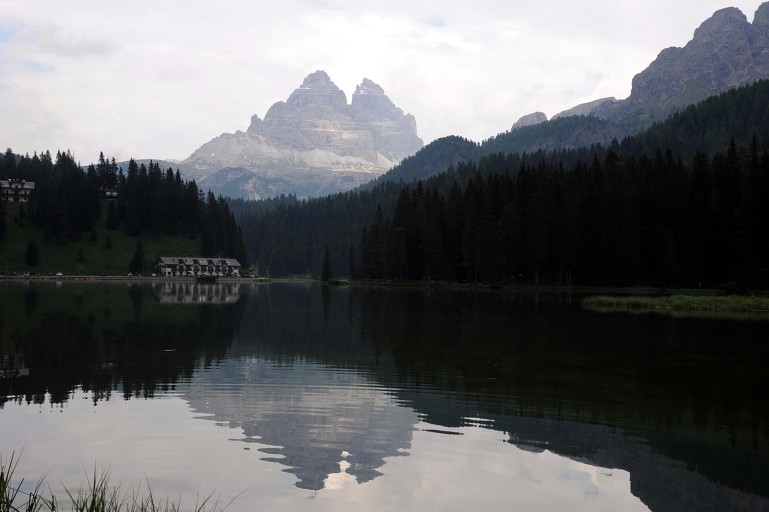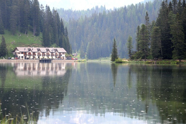 이번에는 아름다운 호수를 찾아간다. 1.756m고지에 분지 위에 빙하에서 녹아 내린 물로 맑고 청정한 호수가 생겨난 곳이다. 호수 주변의 “Monte Pluna” 산(2.305m)과 “Cadini” 산과 그 아래 자리 잡은 호텔 풍경이 어울러져 물속에 잔영이 투영되어 일렁거린다. 주변에도 수많은 모터 싸이클을 타는 젊은이 들이 모여 들어 아름다운 절경을 즐긴다.