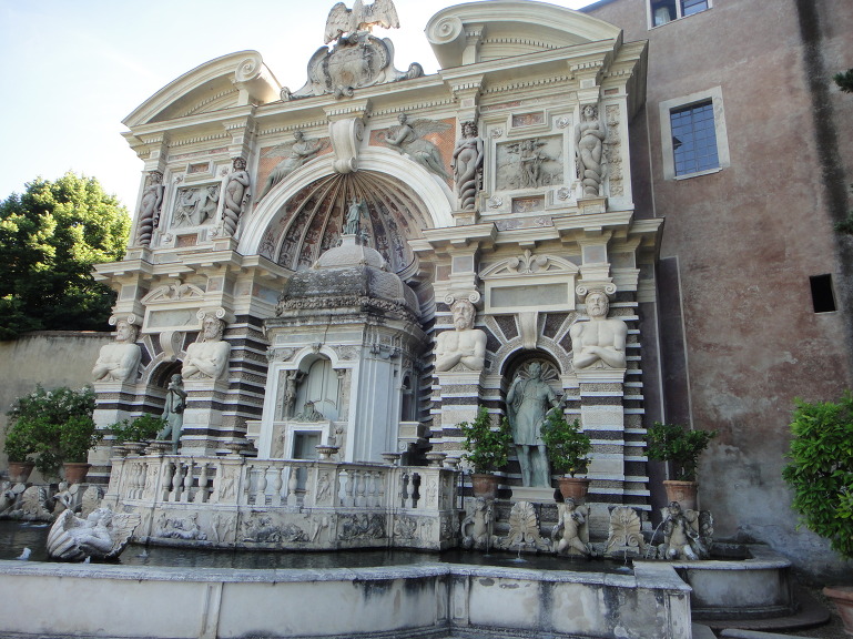 다. 둘째 단에는 장식 대리석을 사용하였고, 셋째 단에는 여러 인물들의 표정으로 장식되어 있다. 이 분수의 물은 티볼리로 부 터 로마를 흐른는 “Aniene” 강을 의미한다.