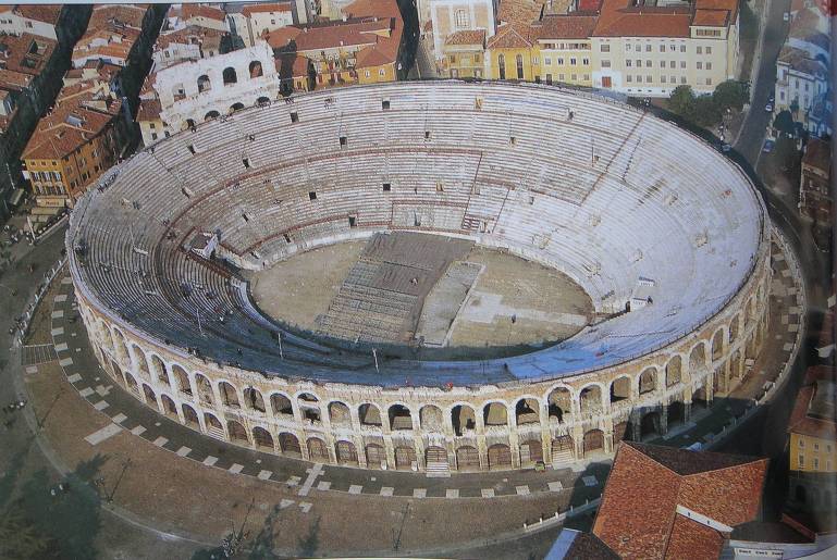 로마시대의 원형극장으로 중세도시의 성밖에 위치하고 있다. 이 경기장은 1세기 초에 세워진 것이나 3세기에 와서 “Gallienus” 황제가 지금처럼 크게 지었고 규모나 웅장한 면에서 로마의 “Colosseum” 다음의 규모를 자랑한다. 서의 축성은 베로나 주변에서 모은 벽돌과 돌로 축성하였다. 지금 남아있는 2층의 아취는 장미빛 붉은 돌로 쌓은 것이다. 서의 벽은 수세기 지나는 동안 무너지고 지금은 1층에 남아있는 4개의 아취가 3층까지 이어져 있다.