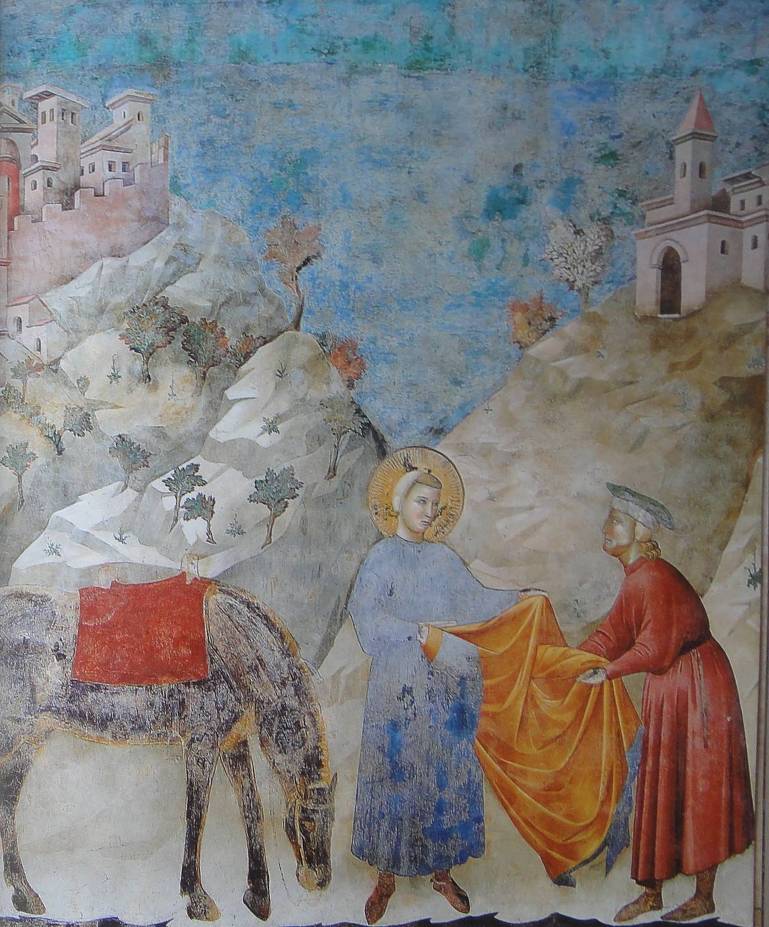 그러다가 우연히 문둥병 환자를 만나면서 그의 생은 종교적인 삶으로 바뀌었다. 그는 자기의 옷을 병자에게 벗어 입히고, 그를 끌어안으면서 몸에서 전율이 일어나고 내면에서는 기쁨과 평안이 충만한 체험을 겪게 되었다. 이런 일이 일러난 후에 그는 그의 재산을 모두 가난한자에게 나누어 주고 특히 문둥병 환자를 돌보면서 검소하게 살아가는 변화를 일으키게 되었다. 그로 인해 가난하고 병든 사람들을 위한 수도회가 그의 이름으로 탄생되었고, 그들의 모임은 더욱 나환자와 버림받은 사람들의 구원에 전념하게 되어 많은 수도사들이 그를 따르게 되었다. .jpg)