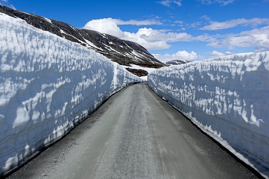 송네피엘레 풍광국도에서 들러야 할 디투어 작품을 놓쳐 어디서 버스를 돌려야하나 고심하며 당황하던 순간, 갑자기 나타난 설산에 닿을 듯 쭉 뻗은 길은 나의 온갖 근심걱정을 잊게 해주었다. 이어서 만난 감레 스트뤼네피엘스베겐에서는 6월말임에도 불구하고 차보다 더 높은 설벽(雪壁)에 버스를 보내버리고 무작정 그 길을 따라 걷지 않을 수 없었다. 그리고 트롤 요정들이 왕성하게 활개를 치는 비가 오던 날, 리듬체조 리본이 날아가는 듯한 모양의 험난한 산악도로인 트롤스티겐에서는 정말 트롤이 나올 것만 같았다.