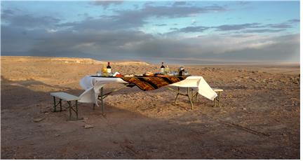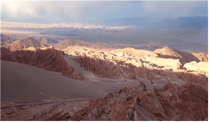그리고 한편으로 미스칸티 호수의 아름다움을 깡그리 잊게 하고 공포와 놀라움을 안겨준 ‘죽음의 계곡’과 ‘달의 계곡’이 있었다. 2천만년 동안 비 한 방울 내리지 않았다던 완전한 불모지가 만들어 낸 이 지형은 수수께끼처럼 보였다. 침식, 융기, 퇴적, 풍화, 화산, 용암 등등의 현상과 작용이 만들어 낸 자연의 역사를 그저 바라볼 뿐이다. 생명의 흔적이 전혀 없어 달의 지형과 가장 유사하여 현재 우주인들의 훈련장소로 이용된다는 달의 계곡. 그곳은 완전히 또 다른 세계, 원시적인 느낌이었다. 아타카마의 거대한 자연이 주홍빛으로 물들어 갈 쯤 죽음의 계곡으로 달려가 일몰을 지켜보았다. 빛이 사라진 세상의 또 다른 장관 앞에서 여행의 감회와 기쁨과 감사로 ㅡ숙연해졌다. 그 장엄한 공간 한 곁에 테이블이 차려지고 테이블보 자락이 바람에 휘날리는 가운데 와인 세팅이 되어있었다. 뜻밖의 근사한 이벤트였다. 처연한 죽음의 계곡에서 함께 한 지난 여정의 즐거움과 아쉬움을 나누는 멋진 대미였다.