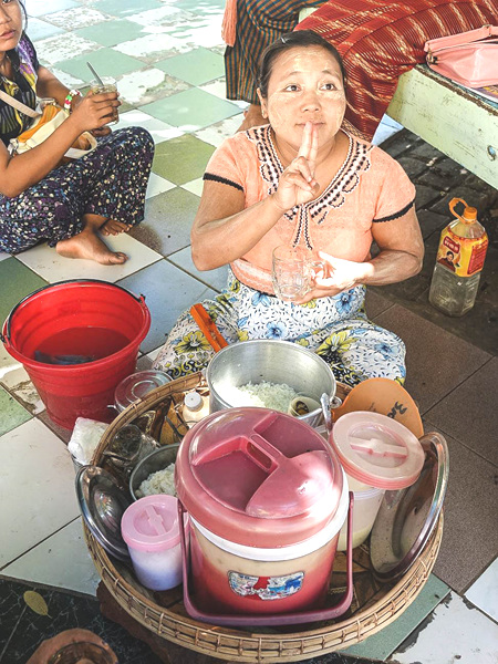 사가잉의 한 사원에서 만난 푸근한 인상의 아주머니도 그랬다. 나는 아주머니가 그늘 한구석에서 팔고 있는 음식이 궁금하기도 했고, 현지인들이 빙 둘러싼 모습을 사진에 담고 싶어 가까이에 서서 지켜봤다. 분명 내가 단순 호기심으로 바라보고 있음을 알았을 텐데도 아주머니는 순박한 미소로 이방인을 맞이해 줬다. 그리고는 계속해서 자신이 돈 받고 팔아야 할 만두며, 샐러드며, 국수를 먹어보라고 내주기 시작했다. 소박하지만 자신이 가진 것을 함께 나누고 싶은, 귀엽다고까지 느껴지는 미얀마식 정(情)이었다.