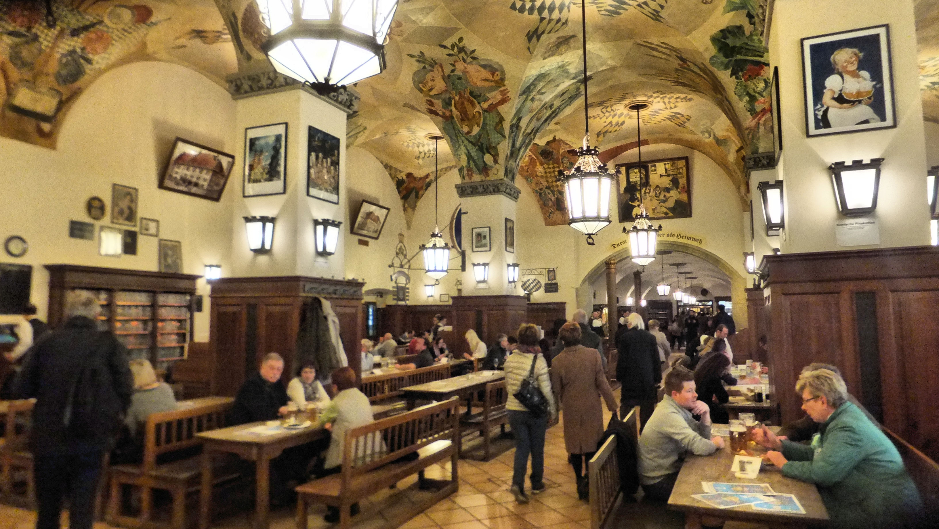 사진으로 미리 보고 갔지만 실내로 들어서자 상상을 초월한 크기와 시끌벅적함에 입이 떡하니 벌어졌다. 높은 천장에는 화려한 천장화가 가득 그려져 있었고, 홀에는 사람들이 빼곡하게 들어앉아 있었다. 3kg이나 된다는 두꺼운 1L 맥주잔을 들고 신나게 건배하는 사람들 사이로 종업원들이 그 무거운 잔들을 가득 들고 바쁘게 걸어 다니고 있었다.