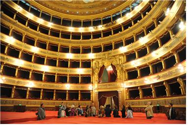 차르트의 <돈 조바니> 공연이 올려 질 예정이어서 무대 장치가 한창이었다. 천정과 벽은 아름다운 여신, 천사, 꽃 그림으로 장식되어 있는데 색감도 부드럽고 과하지 않아 고급스럽다. 전형적인 신고전주의 기법이다.