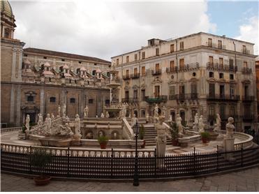 성당을 나와 팔레르모의 중심축이 되는 콰트로 칸티를 둘러보고 수치의 분수가 있는 프레토리아 광장으로 왔다. 나신의 조각상들이 분수대를 중심으로 둥글게 서있는 상당히 큰 분수다.