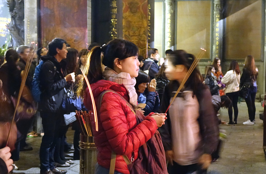 이윽고 용산사에 도착했을 땐 이미 밤이었는데도 많은 사람들이 모여 제각기 향을 든 채 기도를 하고 있었다. 대만 사람들의 기도 방식은 아주 독특해서 절에서 모시고 있는 신에게 향을 먼저 조공한 뒤 마음속으로 자기소개를 하고 소원을 이야기한다. 소원을 얘기할 때에는 반드시 ‘예’ 또는 ‘아니요’라는 답이 나올 수 있도록 해야 한다. 신의 대답여부는 반달 모양의 나무 조각 두 개를 던져서 알 수 있는데, 그래서 절 내에는 짙은 향냄새와 함께 나무 조각을 연신 던지는 사람들로 가득하다.